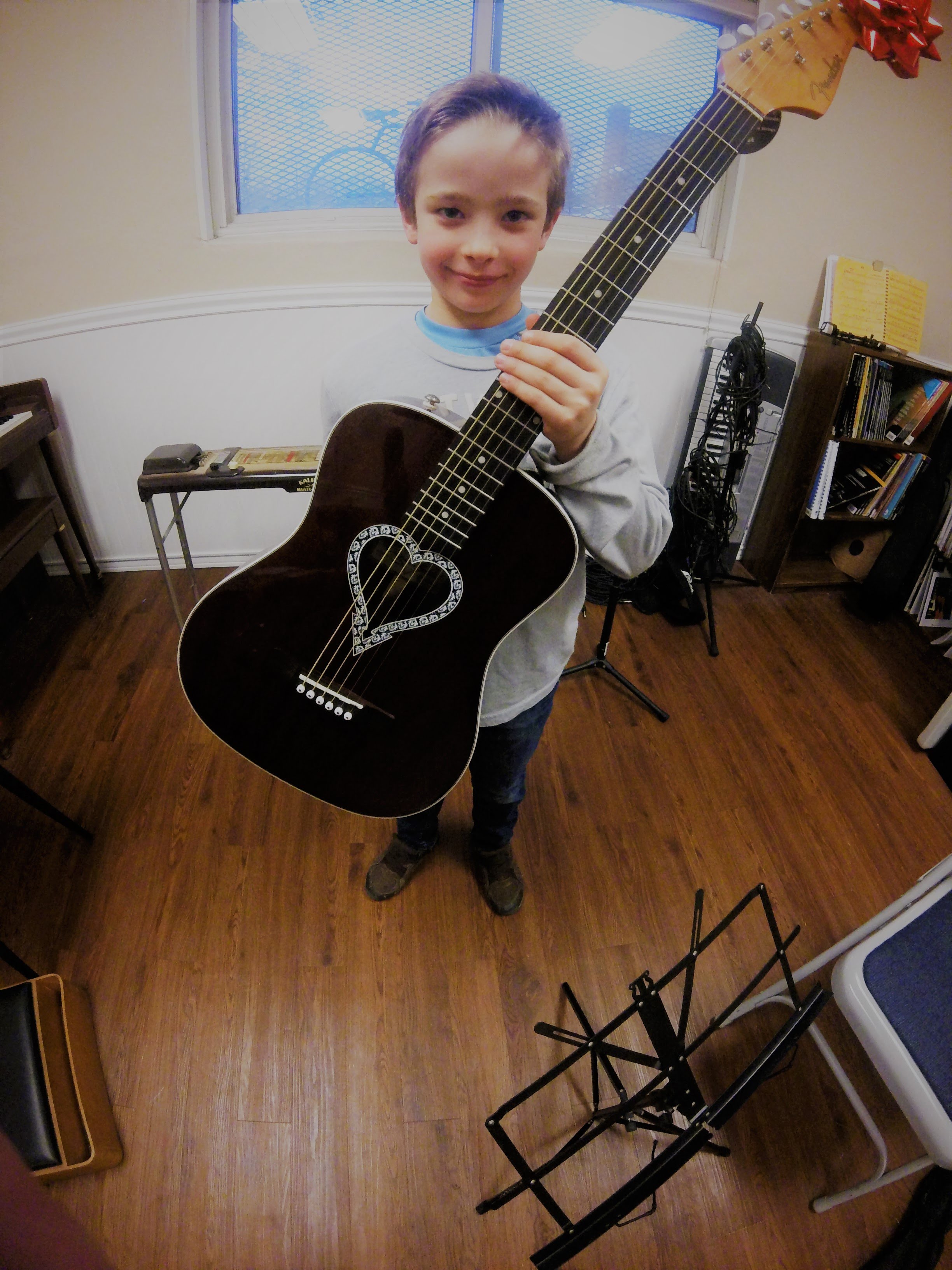 For students and parents new to guitar music lessons: There are three types of guitars to choose from – nylon string acoustic guitars, steel string acoustic guitars and electric guitars. Most kids fantasize about being rock stars and want to start right away on electric steel string guitars. This isn’t always a good idea. Electric guitars are generally more expensive and require support purchases as well, like an amplifier, cables. While there are some mini size electric guitars available on the market, most kids don’t choose them and purchase electric guitars that are too big and heavy for them to handle. Then they can become discouraged by the feel of the steel strings on tender fingertips that haven’t developed. Soon electric guitars sit unused and collecting dust in the closet. I find it’s best to have students work up to the electric guitar of their dreams with at least a commitment of a year or two of lessons. This also helps them develop finger strength and appreciation of a practice routine worthy of the electric guitar investment.