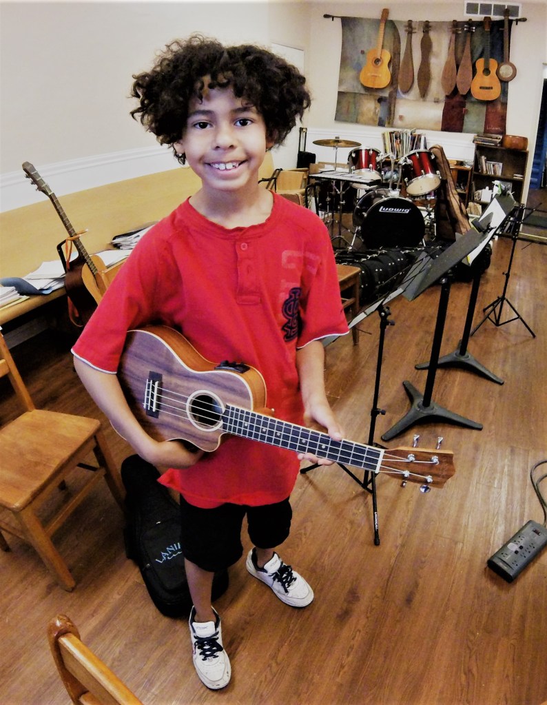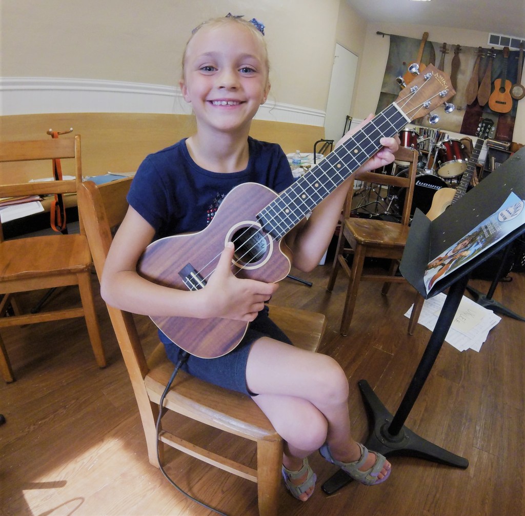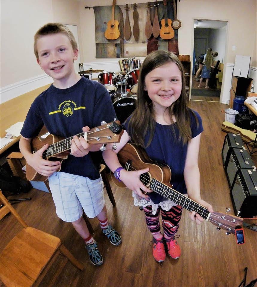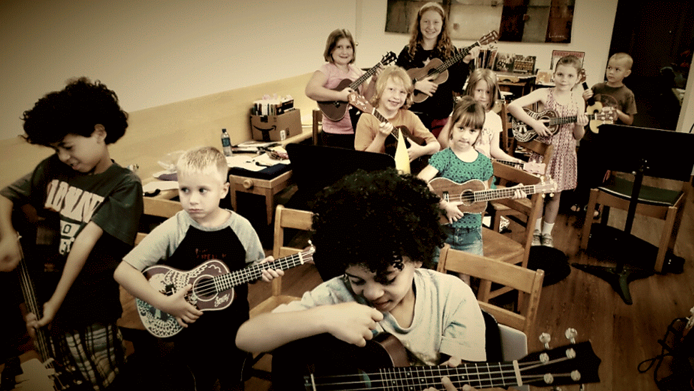 Ukuleles are a great way for the very young (5 and up) to get started. The size of the instruments make it easy for kids to manage. They can learn to read music charts, chords and chord frames, strumming patterns, and beginning note reading. They also develop their voices and begin to sing!